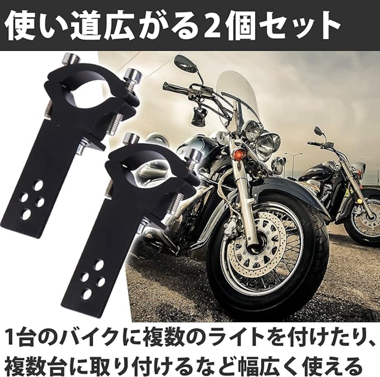 アイデア次第で使い道も広がる:汎用タイプのバイクステーなので、内径可動範囲内のパイプであればどこにでも取り付け可能です。アイデア次第で使い道が広がるので自由度が高いです。2個セットなので、複数のライトの取り付けにも適しています。