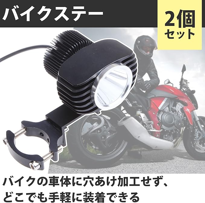 簡単に装着できるバイクステー:バイクの車体に加工を施したりせずに手軽に装着できるバイクステー2個のセットです。内径の可動範囲は約22mmから約36mmまでとなっています。フォグランプや作業灯などの取り付けに適した固定器具です。