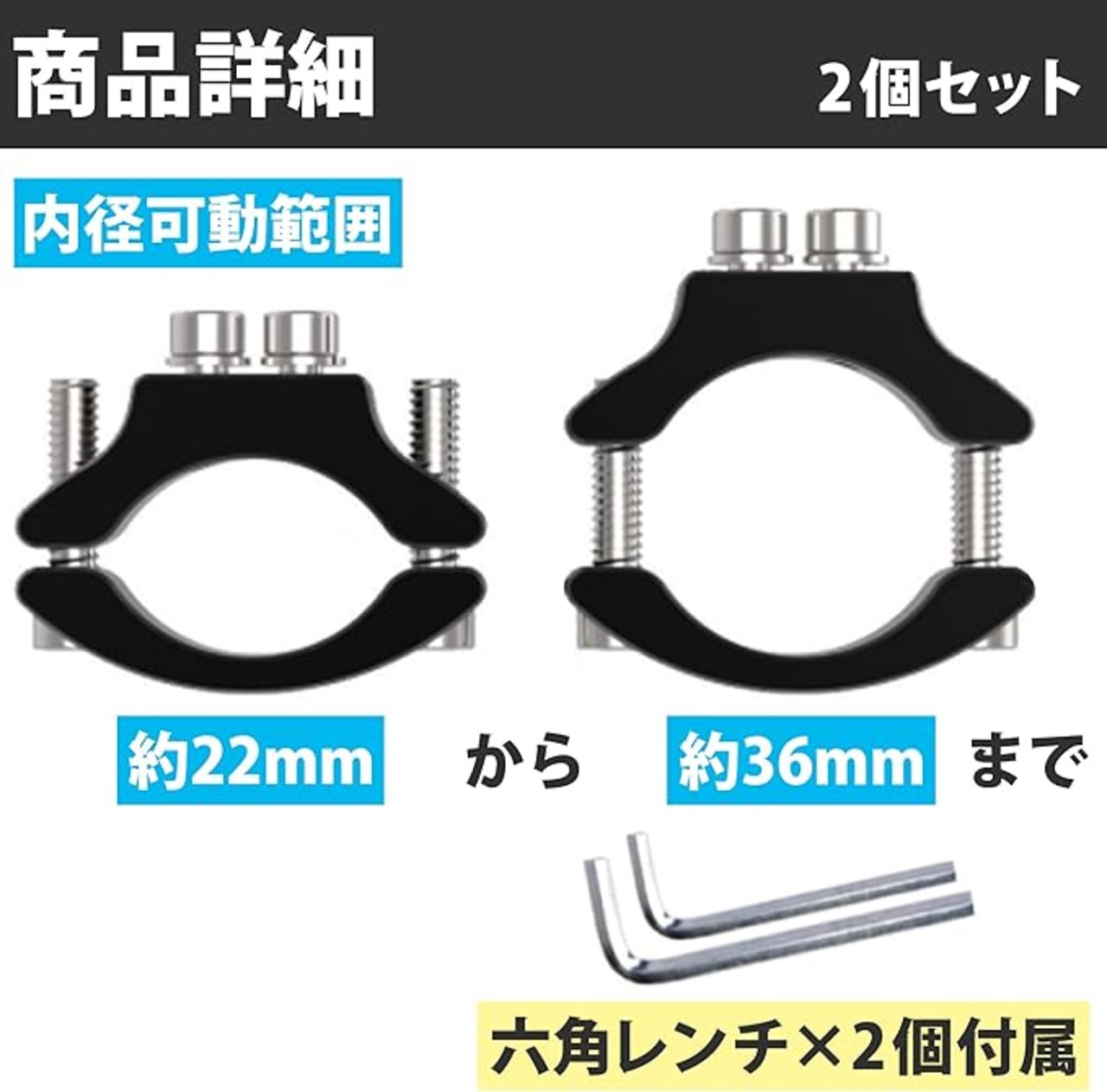 セット内容:2個セット 内径可動範囲:約22mmから約36mmまで 素材:アルミ合金、ステンレス カラー:ブラック 付属品:六角レンチ 2個 ※モニターの環境等により、色の見え方に若干差が生じる場合がございます。