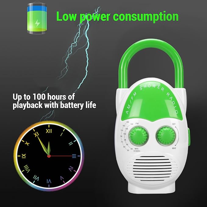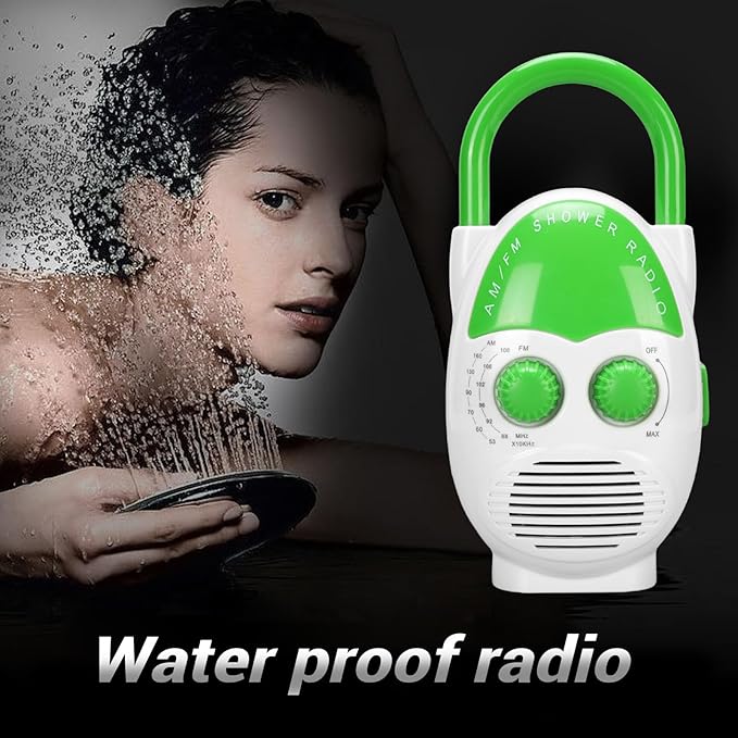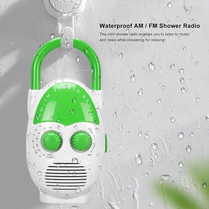 IPX5水プルーフデザインを備えたポータブルAM FMラジオ、500MWスピーカー出力、ホームバスルーム旅行用バッテリー駆動シャワーラジオ屋外での使用、グリーン