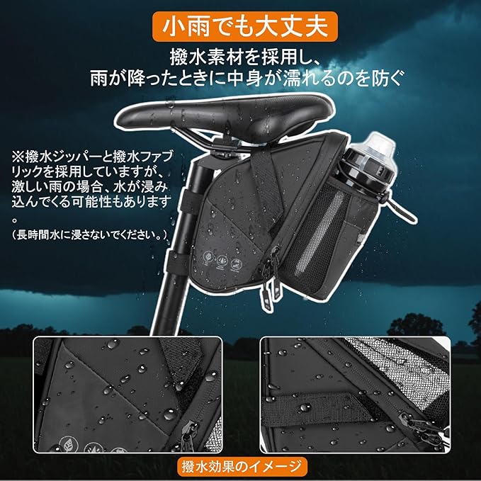撥水性能:サドルバッグの生地とジッパーに撥水素材を採用し、雨が降ったときに中身が濡れるのを防ぎます。雨だけでなく、後輪からの水跳ねも心配がありません。※撥水ジッパーと撥水ファブリックを採用していますが、激しい雨の場合、水が浸み込んでくる可能性もあります。(長時間水に浸さないでください。)