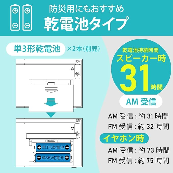 【 仕 様 】 ◆電源:DC3V 単3形乾電池 2本(別売) ◆受信周波数:AM…530~1605kHz、FM…76~108MHz ◆スピーカー:口径50mm 1(8Ω) ◆乾電池持続時間:・ スピーカー時…AM受信/約31時間、FM受信/約32時間・ イヤホン時…AM受信/約73時間、FM受信/約75時間