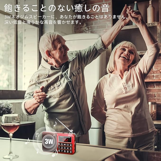高音質ファン向け: 1) USBドライブ/TFカードをサポートします(0-32GB )。 追加のMP3機能があることを意味します。 2) AUX機能付き。簡単にあなたの携帯電話やコンピュータのスピーカーとしてラジオを使用することができます。 3) 信頼性の高い低音と滑らかな高音を 提供する3W内蔵磁気スピーカーを搭載。また、充電式ラジオなので、バッテリーの無駄を気にすることなく、高音質の音楽を存分に楽しむことができます。