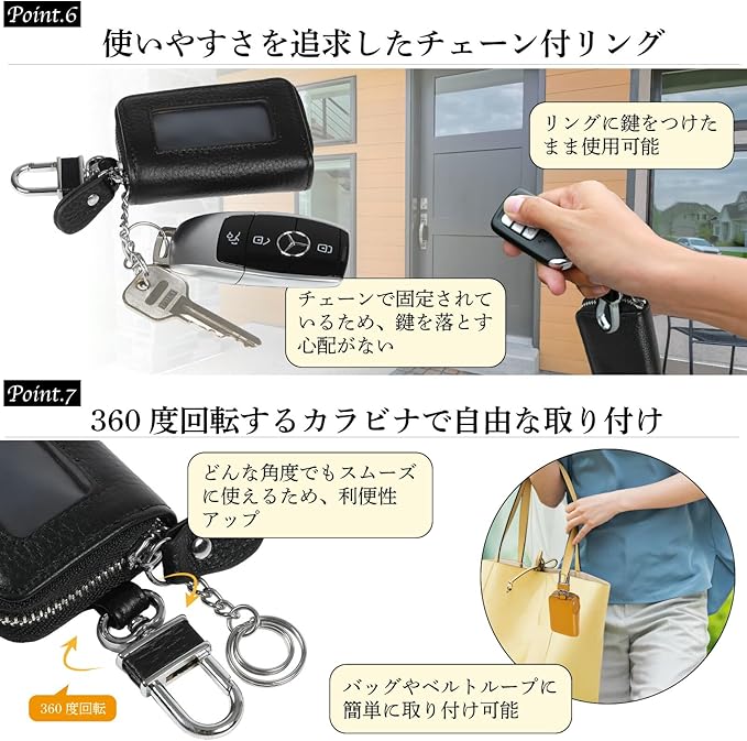 360度回転カラビナ付きで使いやすい! キーホルダー感覚で使えるカラビナ付きで、バッグやズボンのベルトループに簡単に取り付け可能。360度回転式のため、角度を気にせずスムーズに使えます。 トヨタ・日産・ホンダ・スバル・スズキ・ダイハツ・マツダ(toyota、hondaなど)などのスマートキー対応で、多くの車種に適合。車の鍵をおしゃれに収納できるキーケースです。 LIXIL(リクシル)の玄関ドア用リモコンキーにも対応。