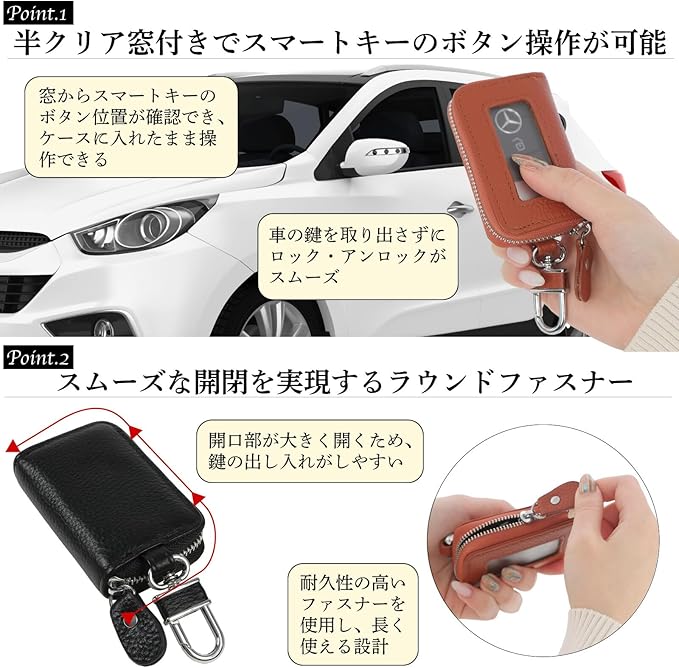 スマートキー対応!コンパクトでおしゃれなキーケース スマートキー対応のラウンドファスナー型キーケースです。メンズ・レディース問わず使えるシンプルデザインで、車のキーやリモコンキーをしっかり収納できます。 窓付き仕様のため、ケースに入れたままスマートキーのボタン操作が可能。コンパクトで持ち運びやすく、バッグやポケットにもスッキリ収納できる便利なスマートキーケースです。