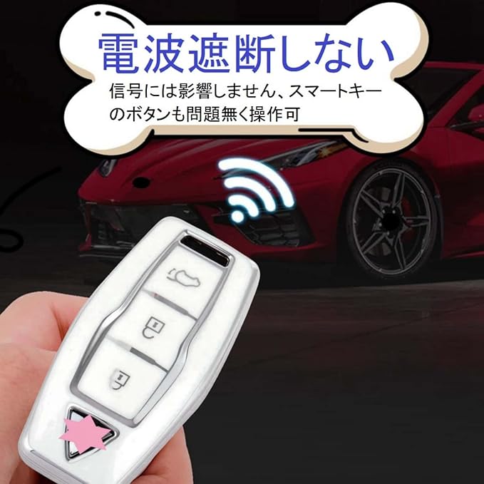 【電波が遮断されないし】ボタンは明確で、信号には影響しません、スマートキーのボタンも問題無く操作可。シルバーエッジのデザイン、キラキラしていて、 メタリックの光沢があり、めちゃくちゃ可愛い、耐久性、使いやすさ、軽さグッとです。また明るい色ではカバンなどから探しやすいです、可愛い目立つのでバッグの中から、素早く取り出せて。