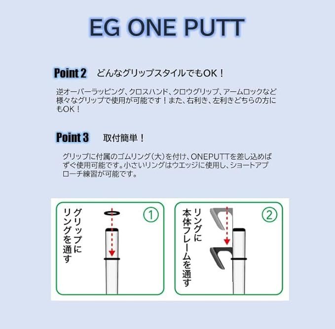 ✅️【使い方】①パターグリップに付属のゴムリングを通します。②本体のフレームをグリップ右側(左利きの方は左側)の上からゴムリングに通します。③ご自身のグリップスタイルに合わせて本体の位置・角度を調整して装着完了です。