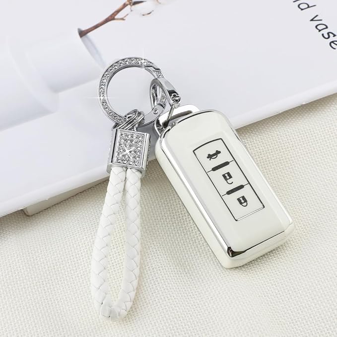 [Catland] 三菱 キーホルダー キーケース 3ボタン RVR ekワゴン ekスペース ミラージュ アイミーブ アウトランダー ekスペース ランサーエボリューション デイズ 鍵 キーカバー スマートキーケース キーチェーン ドレスアップ パーツ アクセサリー 工具付き ホワイト シルバーエッジ