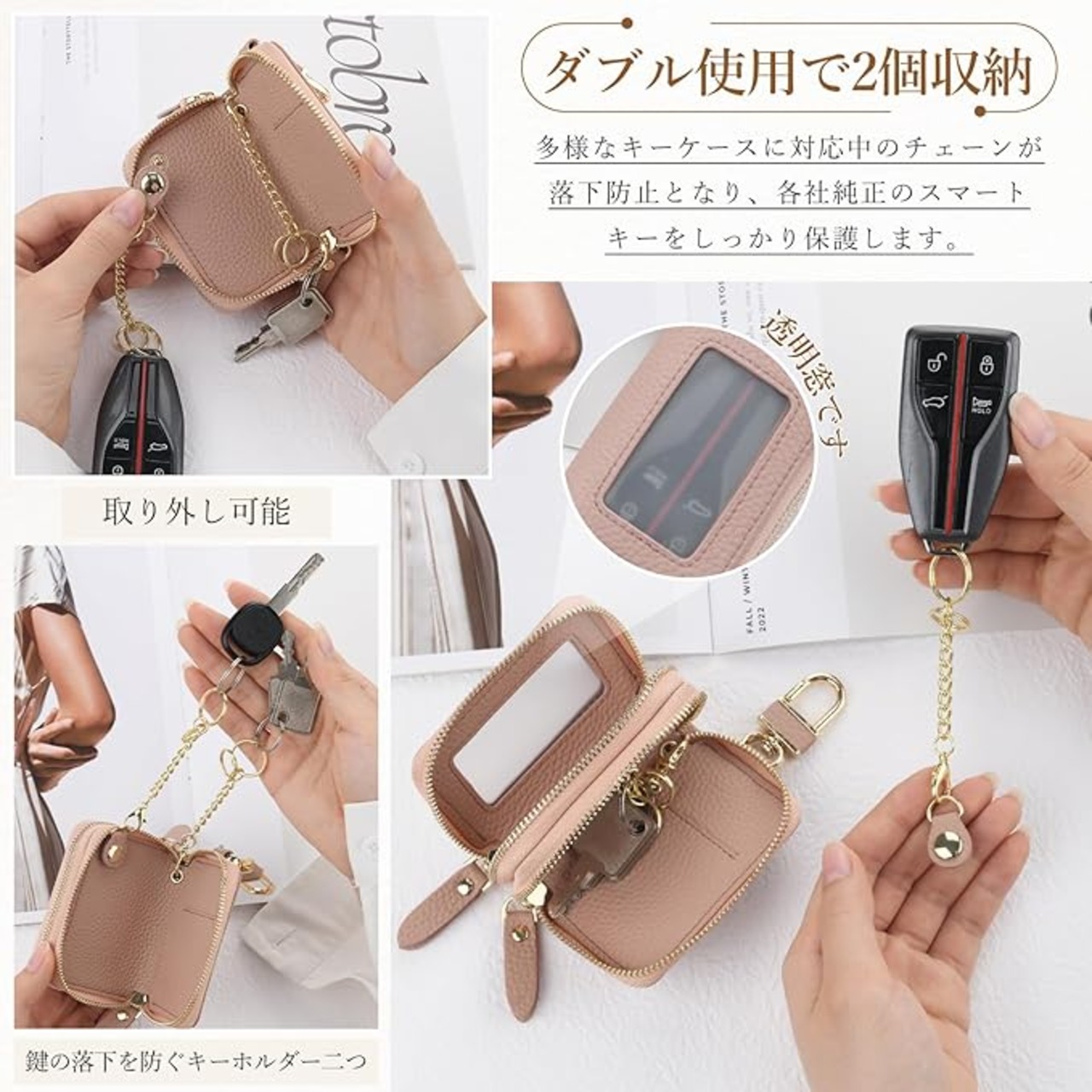 [Chillchi] スマートキーケース 2個収納 レディース メンズ 革 窓付き 車 カバー カラビナ付き クリア窓 ダブル スマートキーケース ファスナー 鍵 ダブルポケット ダブルファスナー