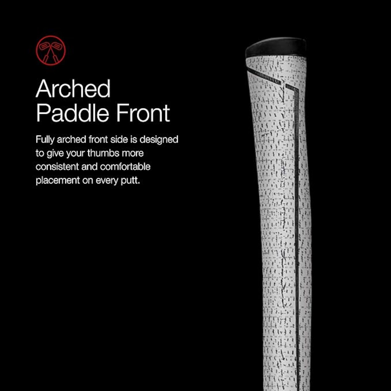 新しいプロオンリーコードパターグリップは、グリーンでの最適なフィードバックと精度のために、 より硬いラバーコンパウンドで親指を配置するためのアーチ型のパドルフロントを備えます。