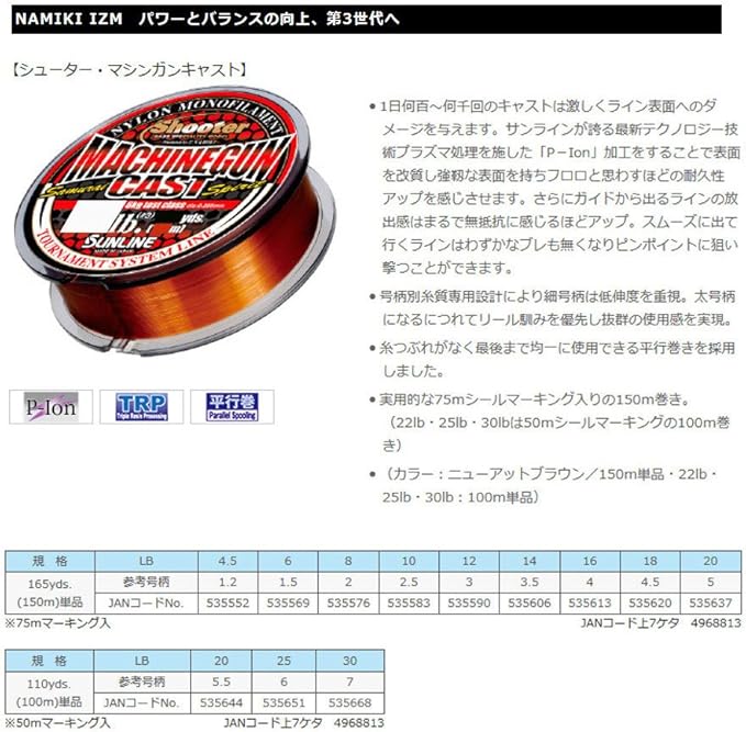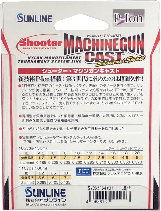 ●1日何百~何千回のキャストは激しくライン表面へのダメージを与えます。 サンラインが誇る最新テクノロジー技術プラズマ処理を施した「P-Ion」加工をすることで表面を改質し強靱な表面を持ちフロロと思わすほどの耐久性アップを感じさせます。 さらにガイドから出るラインの放出感はまるで無抵抗に感じるほどアップ。スムーズに出て行くラインはわずかなブレも無くなりピンポイントに狙い撃つことができます。 ●号柄別糸質専用設計により細号柄は低伸度を重視。 太号柄になるにつれてリール馴みを優先し抜群の使用感を実現。 ●糸つぶれがなく最後まで均一に使用できる平行巻きを採用しました。 ●実用的な75mシールマーキング入りの150m巻き。(22lb・25lb・30lbは50mシールマーキングの100m巻き) ●(カラー:ニューアットブラウン/150m単品・22lb・25lb・30lb:100m単品)