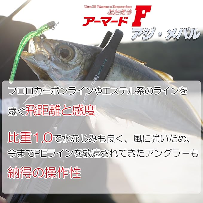 従来PEラインより、バックラッシュや結びコブなどのライントラブルが激減、飛距離10%アップ、低伸度で感度は2倍。