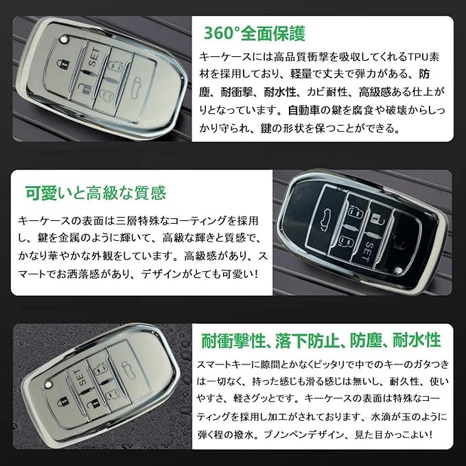 【360 全面保護】キーケースには高品質衝撃を吸収してくれるTPU素材を採用しており、軽量で丈夫で弾力がある、防塵、耐衝撃、耐水性、着地緩衝の効果があります。キーケースの表面は特殊なコーティングを採用し加工がされております、水滴が玉のように弾く程の撥水、自動車の鍵を腐食や破壊からしっかり守られ。360 全面保護、するため 落としてもキーに 傷がつくことはありません。