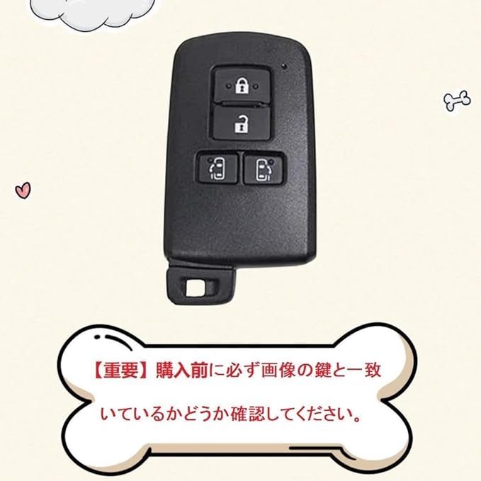 【適合車種】: 適合トヨタ ヴォクシー (VOXY) 80系・ ノア (NOAH) 80系・エスクァイア (Esquire) H26.10~ ・新型ヴェルファイア 30系・ 新型アルファード 30系 ・新型クラウン21系 ReBORN・新型シエンタ 170系 (2015年7月~) (4ボタン 、両側スライドドア専用 、お使いの鍵の形状をご確認ください)。※ 年式により異なる場合がありますので、画像のキーの形状をご確認下さい。 画像のキーの形であれば適合です。【重要】購入前に必ず左の画像の鍵と一致いているかどうか確認してください。