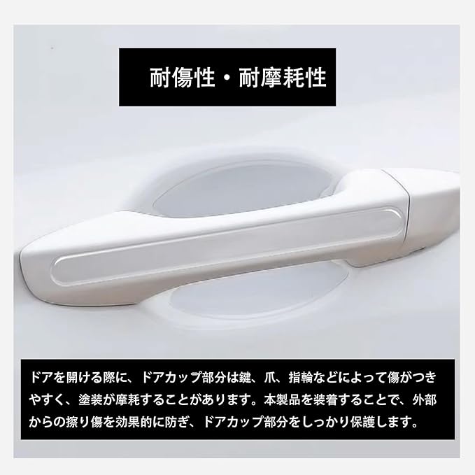 耐傷性・耐摩耗性:ドアを開ける際に、ドアカップ部分は鍵、爪、指輪などによって傷がつきやすく、塗装が摩耗することがあります。本製品を装着することで、外部からの擦り傷を効果的に防ぎ、ドアカップ部分をしっかり保護します。