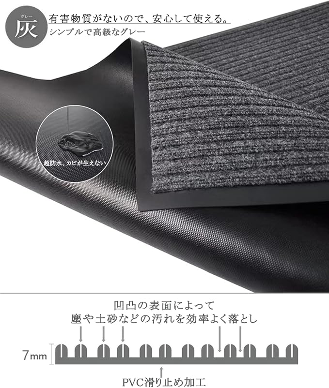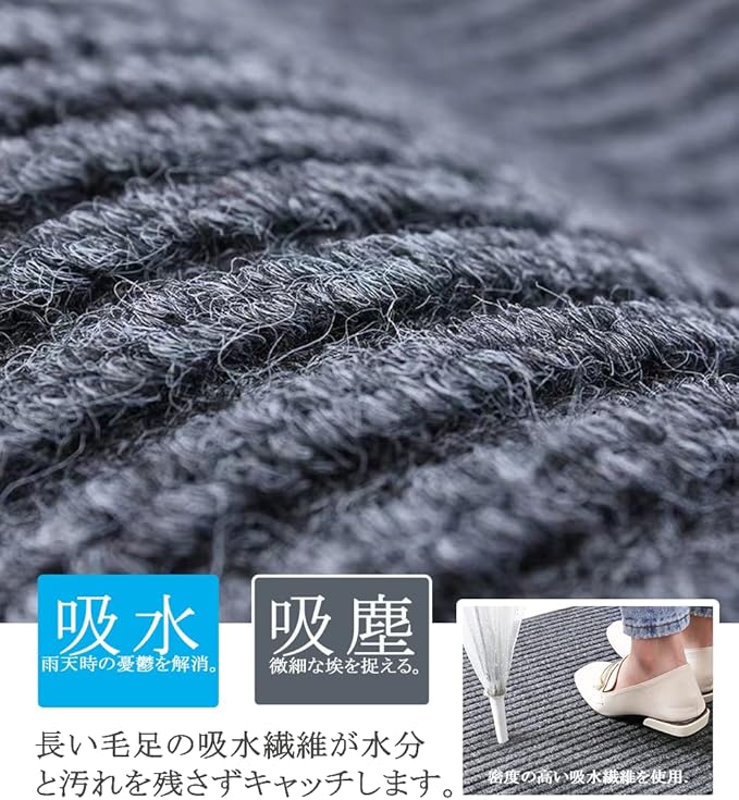 【泥落とし、吸水】屋内、屋外でお使いいただける玄関マットです。表面の凸凹が屋内に持ち込みたくないホコリ汚れや水などをしっかり捕らえ、吸収する機能的なマットです。長い梅雨の日でも大雪の日の中でもフロア汚れを最小限に抑えます!また、マットが抗菌性・防臭性、一年中も快適にご使用いただけます