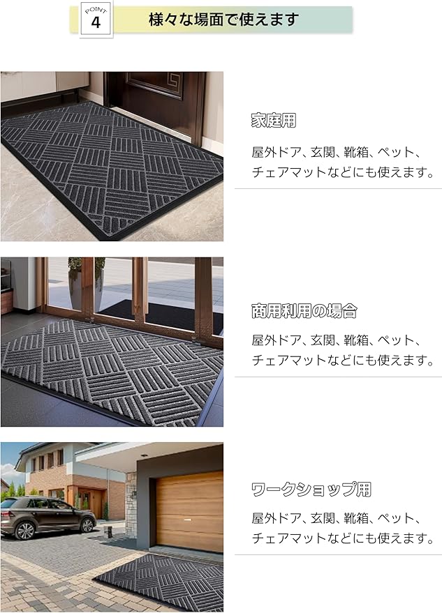 【幅広い用途】多目的に使えるマットです!玄関マットやエントランスマット、キッチンマットなどの室内マットなど様々な用途でご使用いただけます。飲食店、美容院、ビジネス、オフィス、会社、ビル、学校、幼稚園、保育園、店舗、病院、公共施設、レジャー施設などの業務用にも最適です。