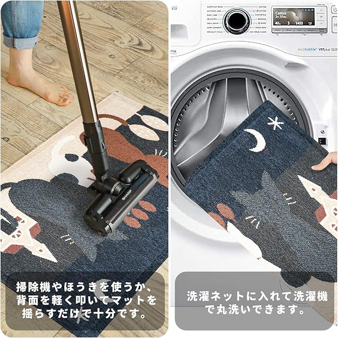 【お手入れ簡単】洗濯可能でいつでも清潔。洗濯ネットに入れて洗濯機で丸洗いできます。速乾性も優れています。あるいは、掃除機やほうきを使うか、背面を軽く叩いてマットを揺らすだけで十分です。※本製品を初めて使用するときは、表面が折シワや歪みになる可能があります。ご了承ください。開封後にまずマットを手に取り、数回振ってみていいですね。