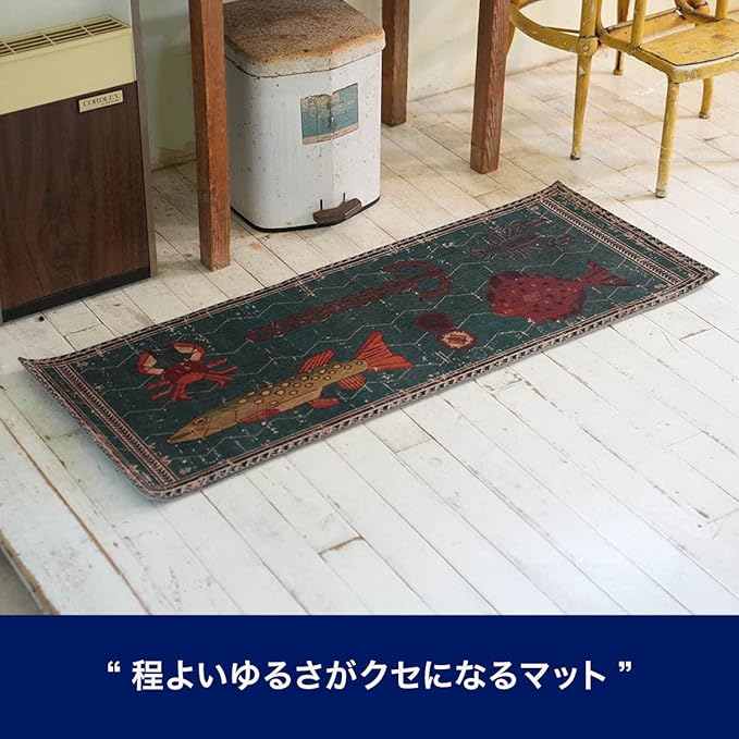 DULTONのプロダクト"FISHIES"をモチーフにデザインに落とし込んだマット。くすんだ色合いに、かすれた柄・模様がビンテージの風合いを感じさせます。裏面には滑り止めが付いており、洗濯機で丸洗いも可能。使い勝手も優秀です。落ち着いた色合いなので、空間に取り入れやすく、個性的な柄がアクセントに。程よくゆるいデザインがクセになりそうです。