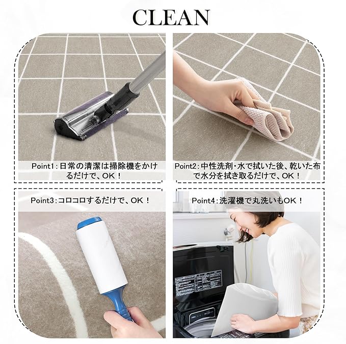 【お手入れ簡単】毛足は短くて密度が高く、ゴミや髪が絡みにくく、日常の清潔は掃除機をかけるだけでキレイ になります。また、汚れた場合は手洗いや洗濯ネットに入れて洗濯機で洗うことができます(ご注意:風通し の良いところで陰干しし、アイロン、乾燥機のご使用をお避け下さい。)