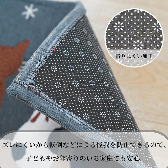 【安心の滑り止め加工】裏面には「滑りにくい加工」を施し、マットがズレにくい仕様になっています。掃除機もかけやすく、床のキズや転倒によるケガを防ぐので、ご高齢の方やお子さまがいるご家庭にも安心してお使いいただけます。厚さ約5mmの設計で、ドアに引っかかりにくく、つまずきにくい快適な使用感を実現しました。