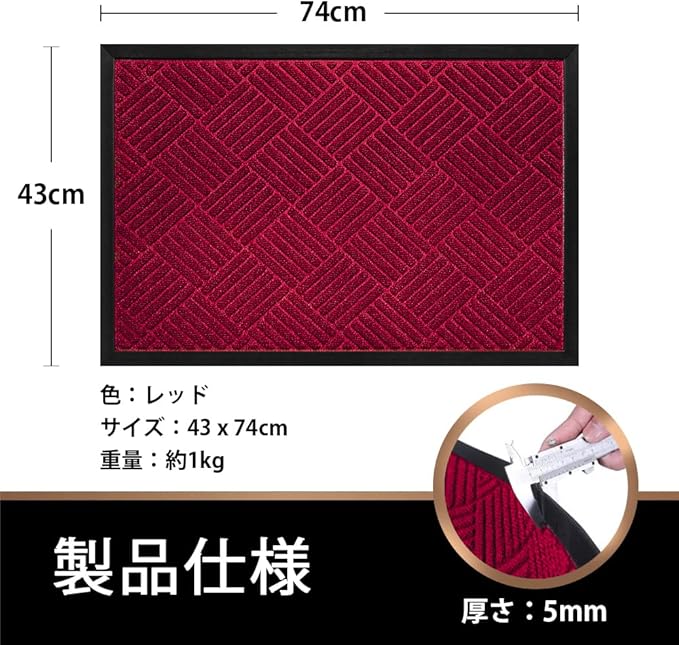 玄関マット ドアマット 泥落としマット 屋内 屋外 業務用 家庭用 (43x74cm, レッド)