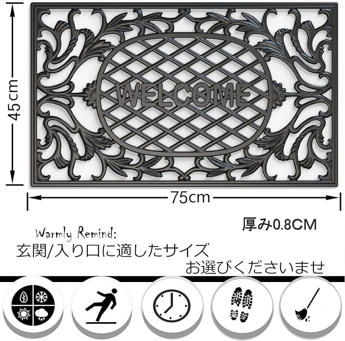 玄関マット 屋外 泥落とし エントランスラバーマット おしゃれ 洗いやすい (ブラックWELCOME柄, 750*450mm)
