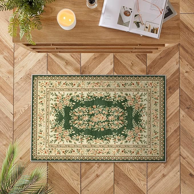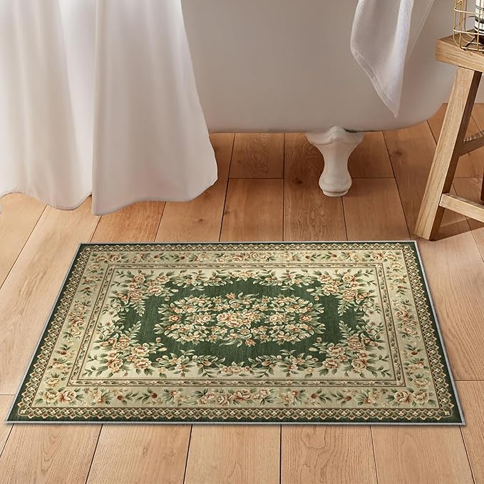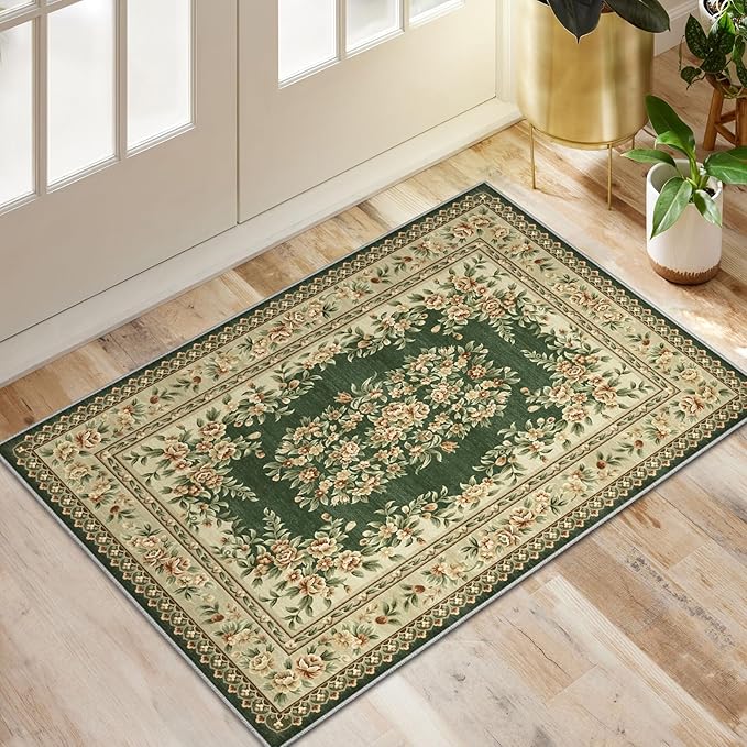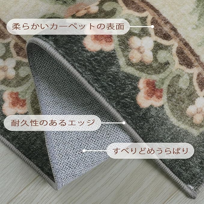 洗える玄関マット 60 90cm 滑り止め付き ペルシャ風 花柄 グリーン 薄手 軽量 キッチンマット ベッドサイド 洗面所用 コンパクト