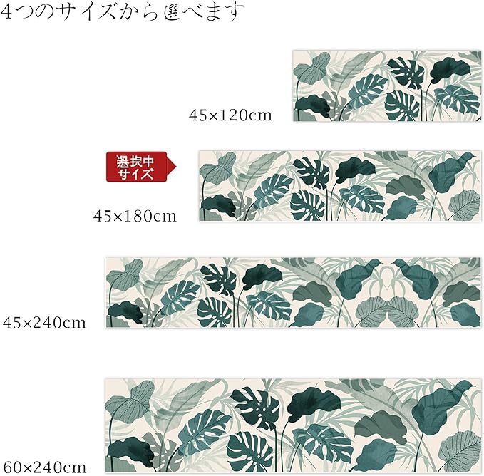 【熱帯植物風のボタニカル柄で癒しの空間に】 緑の葉が織りなすナチュラルデザインで、キッチンや洗面所に癒しと清潔感をプラス。