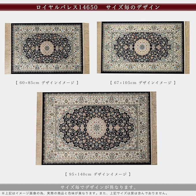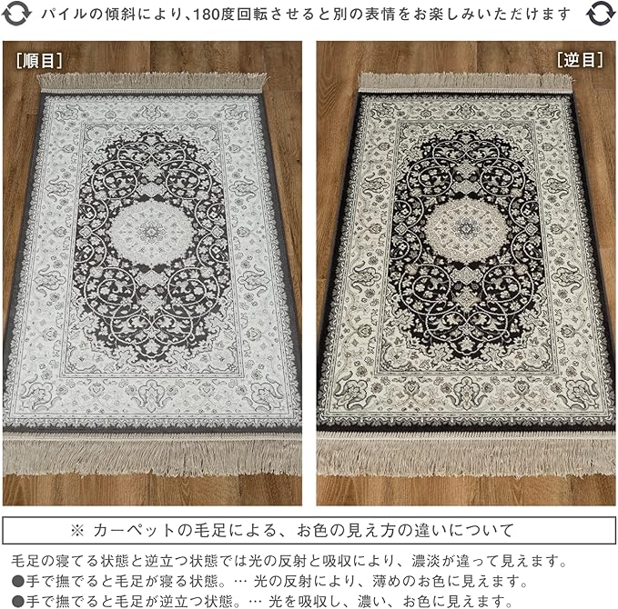 【輸入カーペットを安心してご利用いただくためのお願い】 ●輸入ラグに関して ※同じ商品でも製造ロットの違いによって、サイズや、色味、柄模様の左右が反転していたり、位置がズレている場合がございます。ただし、現地の工場や倉庫での検品をクリアした商品を輸入しています。あらかじめご了承くださいませ。/ ●においに関して ※ご使用当初、裏面に塗られる仕上げの接着塗料(ラテックス剤)のにおいがする場合がございます。人体への影響はありませんが、においに敏感の方や、ご心配の方はご理解の上ご購入お願いいたします。開封後常温のもとで気化(蒸発)するため、においはご使用につれてなくなります。気になる場合は風通しの良いところで陰干ししていただきますと、より早く解消されます。/ ●サイズに関して ※カーペットの製法上、表示サイズより0~3%の誤差がございます。/ ※いずれも商品の初期不良ではございませんので返品・交換は行なっておりません。(※お客様で返品の送料ご負担によるキャンセルは、返品規定に基づきお受けさせていただきます。)/ ※裏面の製品シールは剥がさないでご使用ください。