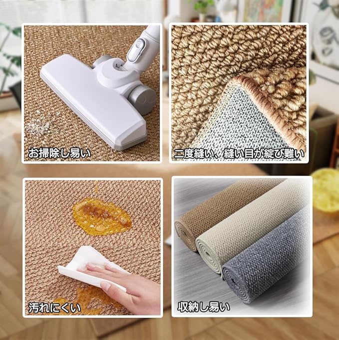 【お手入れやメンテナンスが簡単】 カーペットの材質は瞬間時に防水でき、湿気を防ぎ変形し難い特性があります。摩耗に強く毛並みははへたり難くく、また凹んだ跡もつき難く、水洗い易く、毛玉になり難く、季節を問いませんので使い易く、安心にご使用頂けます