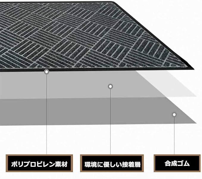 【高品質素材】玄関マットの表面は高品質なポリプロピレンを採用しております。カーペットの裏側はPVC素材で、滑り止め機能に優れ、床を傷つけません。総合的な魅力を実現するために、本製品は安全性、耐摩耗性、耐久性、防汚性および適合性を兼ね備えて開発された製品です。
