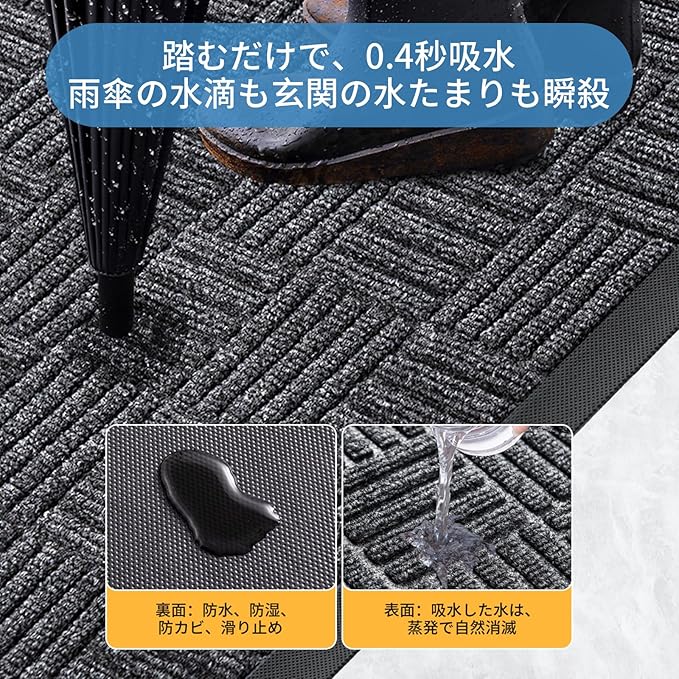 洗える玄関マット:私たちの玄関マットは手入れとメンテナンスが簡単で、洗濯機に入れるか水で流すだけで、非常に低コストで維持できます。おしゃれ玄関マット高密度ポリエステル素材の耐久性で、長期間使用しても色褪せ知らず。玄関マット 洗える立体溝が靴底の汚れをしっかりキャッチ、滑り止め加工裏地で雨の日も安心。軽く叩く部屋マットだけで砂埃が自然に落ちるから、忙しい朝も清掃ラクラク。泥除けマット環境配慮型素材を使用し、繰り返し洗えるエコ設計で、ご家庭から店舗まで幅広く愛用されています