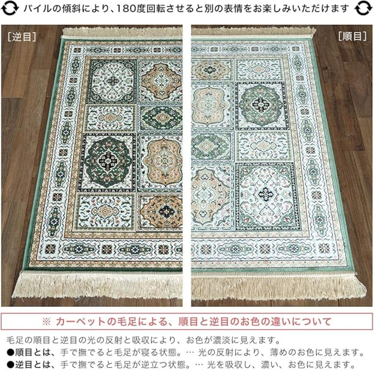 【輸入カーペットを安心してご利用いただくためのお願い】 ●輸入ラグに関して ※同じ商品でも製造ロットの違いによって、サイズや、色味、柄模様の左右が反転していたり、位置がズレている場合がございます。ただし、現地の工場や倉庫での検品をクリアした商品を輸入しています。あらかじめご了承くださいませ。/ ●においに関して ※ご使用当初、裏面に塗られる仕上げの接着塗料(ラテックス剤)のにおいがする場合がございます。人体への影響はありませんが、においに敏感の方や、ご心配の方はご理解の上ご購入お願いいたします。開封後常温のもとで気化(蒸発)するため、においはご使用につれてなくなります。気になる場合は風通しの良いところで陰干ししていただきますと、より早く解消されます。/ ●サイズに関して ※カーペットの製法上、表示サイズより0~3%の誤差がございます。/ ※いずれも商品の初期不良ではございませんので返品・交換は行なっておりません。(※お客様で返品の送料ご負担によるキャンセルは、返品規定に基づきお受けさせていただきます。)/ ※裏面の製品シールは剥がさないでご使用ください。