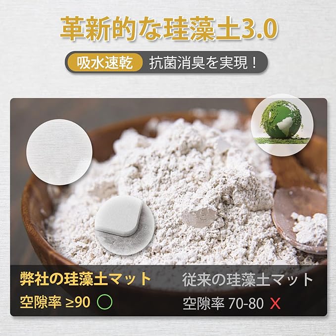 【優れた調湿効果 ・ より衛生的】珪藻土の無数の微細な穴がマットの水分を瞬時に吸水し自立呼吸により水分を放出してくれます。高い吸湿性でダニやカビの発生を抑え、防臭の効果もあり、いつでも清潔に使えます。