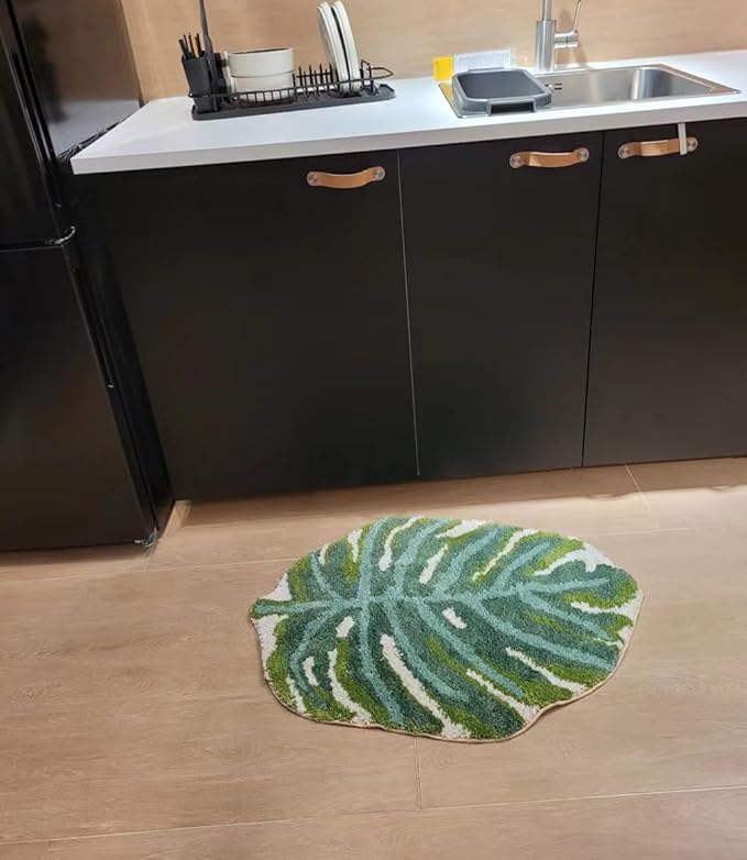 ラグ モンステラ葉形マット 60*80cmバス グリーン絨毯 お風呂 足拭きマット 滑り止め 丸洗い可能 吸水 速乾 超厚い 3D立体 浴室 洗面所 玄関 キッチン 柔らかい (60*80cm, モンステラ グリーン)