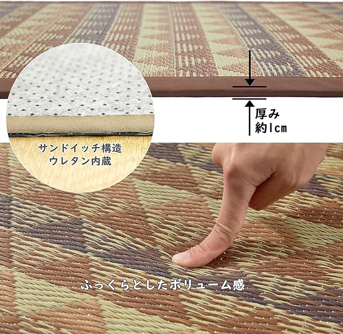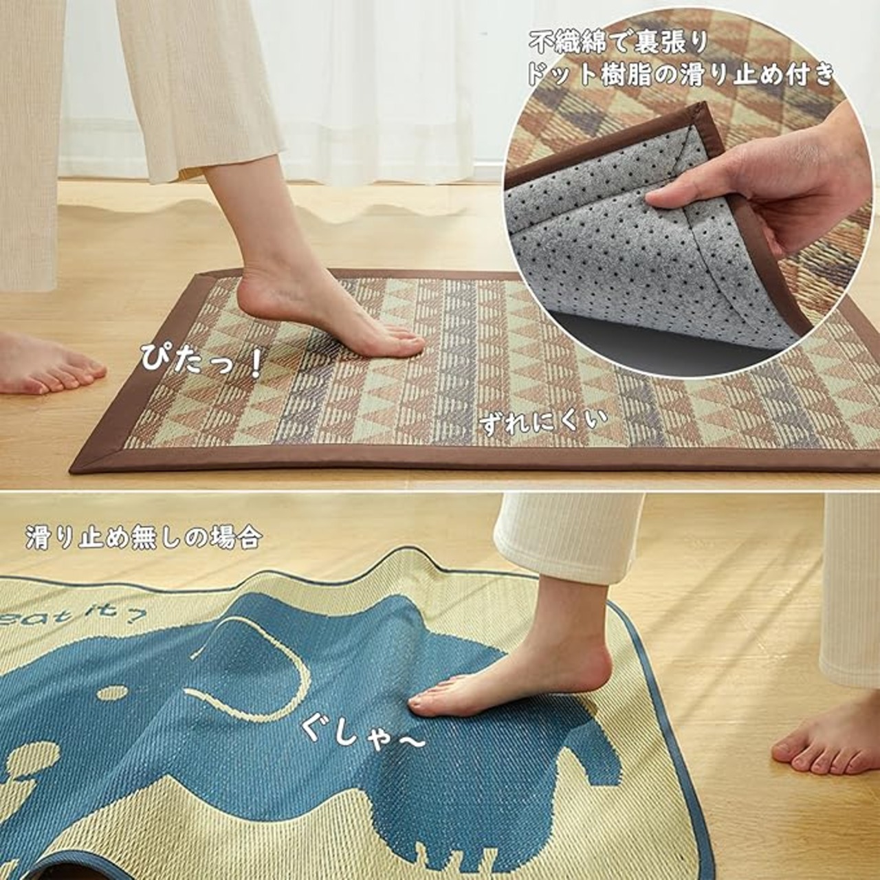 【優れた使い心地】い草には蒸れにくい、ベタつきにくい特性がある上、シーンを問わずいつも爽やか、サラリとした肌触りをキープできます;中材は厚さ8mmのウレタンフォームを使用しております、素足にほどよいクッション性とボリューム感があり、ふっくらとした踏み心地を楽しめます;ドット樹脂加工を施した不織綿で裏貼りをしており、滑り止め効果に優れてフローリングに敷いてもずれにくく、転倒防止の安全対策にもなります。
