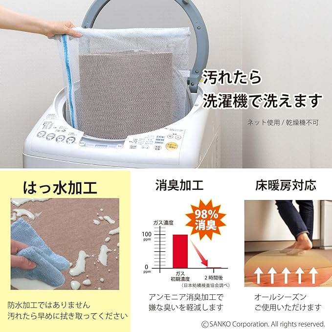 【特徴】撥水加工(防水仕様ではない)、洗濯機可(ネット使用・乾燥機不可)、カット可能、床暖房対応
