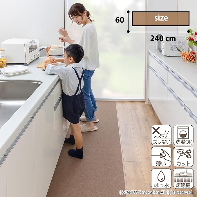 【日本製 撥水 消臭 洗える】サンコー キッチンマット ずれない 台所マット ロング 60 240cm ブラウン おくだけ吸着 KG-06