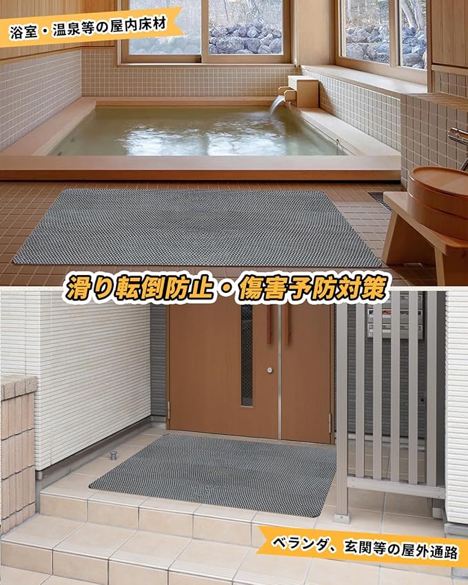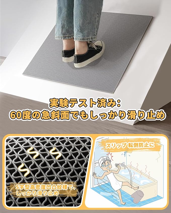 【転倒・滑り防止】:この滑り止めマットは、湿気や滑りやすい場所での転倒を防ぐために設計されています。マット全体がS字型のハニカム構造を持ち、浴室やプールサイドなどでも優れた滑り止めテクスチャーにより安定したグリップを提供し、滑りのリスクを回避します。防滑係数テストをクリアしており、木製デッキ、濡れた木の床、玄関、出入口周辺、傾斜のある滑りやすい場所、タイル、コンクリート、石材の床、金属板、格子状の床など、様々な地面で効果的に滑り止め効果を発揮します