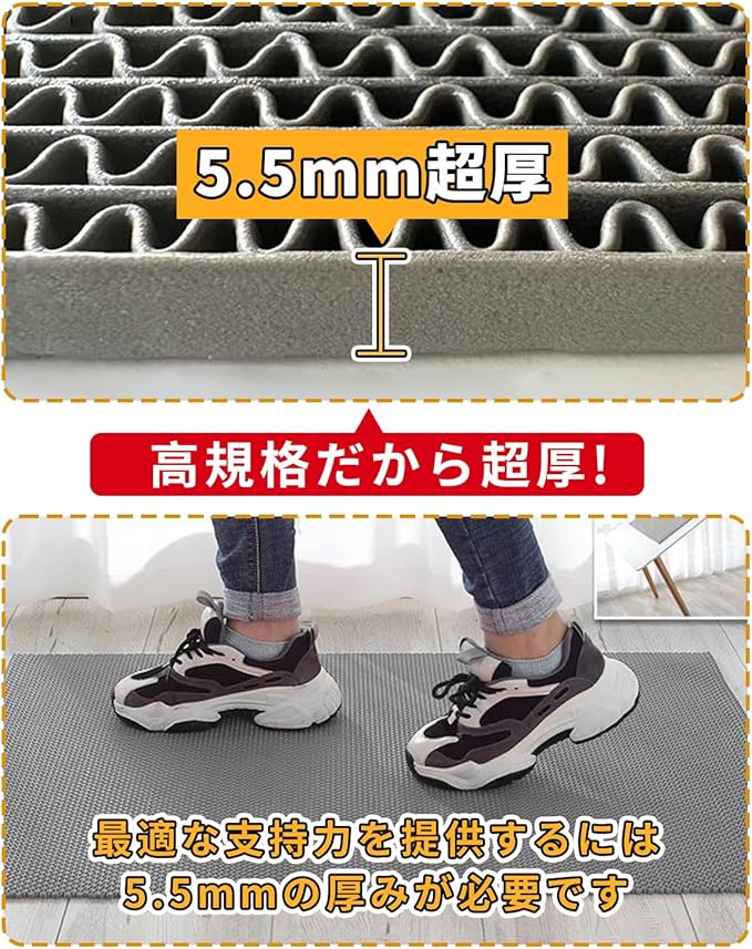【耐摩耗性・耐老化性】:この滑り止めゴムマットは環境に配慮したPVC素材を使用し、防水性、紫外線耐性、耐摩耗性に優れています。無臭で、快適な足触りを提供し、長時間の立ち仕事や歩行による疲れを軽減します。耐老化設計により色あせを防ぎ、日光や長期使用による老化を防止し、寿命を延ばします