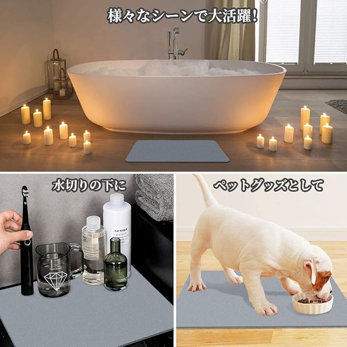 ★【抗菌材質・消臭効果】「調湿」機能で不衛生なバイ菌やカビ菌、ダニなどの繁殖を防ぐことができ、室内のいやな臭いを吸着「消臭作用」も持っています。そのおかげで、浴室、脱衣所、洗面所、キッチンや玄関など、活躍場所は家の中にたくさんあります。また、使用回数や経年変化により表面の目が詰まり、吸水力が低下することがあります。その場合は、付属の紙ヤスリまたは市販の紙ヤスリで表面を軽く磨くと、吸水力を回復させることができます。