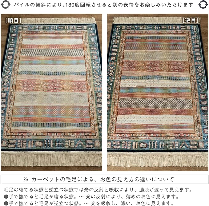 【輸入カーペットを安心してご利用いただくためのお願い】 ●輸入ラグに関して ※同じ商品でも製造ロットの違いによって、サイズや、色味、柄模様の左右が反転していたり、位置がズレている場合がございます。ただし、現地の工場や倉庫での検品をクリアした商品を輸入しています。あらかじめご了承くださいませ。/ ●においに関して ※ご使用当初、裏面に塗られる仕上げの接着塗料(ラテックス剤)のにおいがする場合がございます。人体への影響はありませんが、においに敏感の方や、ご心配の方はご理解の上ご購入お願いいたします。開封後常温のもとで気化(蒸発)するため、においはご使用につれてなくなります。気になる場合は風通しの良いところで陰干ししていただきますと、より早く解消されます。/ ●サイズに関して ※カーペットの製法上、表示サイズより0~3%の誤差がございます。/ ※いずれも商品の初期不良ではございませんので返品・交換は行なっておりません。(※お客様で返品の送料ご負担によるキャンセルは、返品規定に基づきお受けさせていただきます。)/ ※裏面の製品シールは剥がさないでご使用ください。