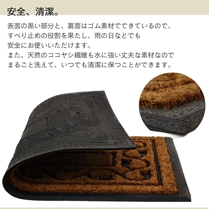 天然のココヤシ繊維を使用した玄関マットで、硬さがあり靴の泥汚れもしっかり落としてくれます。裏面はゴムを使用していますので、滑りにくく安心してご使用していただけます。