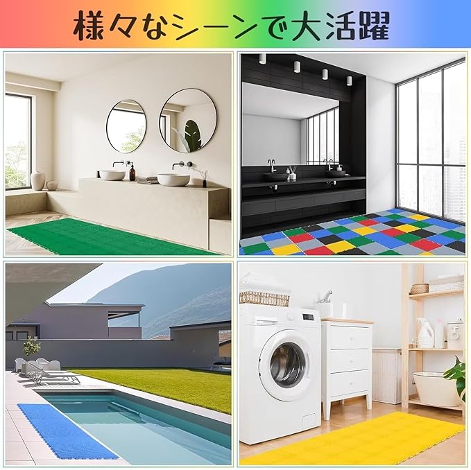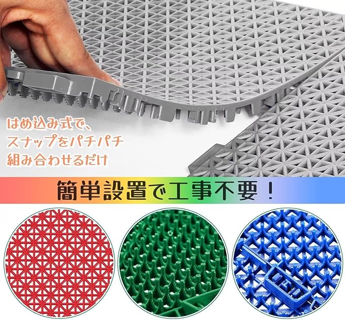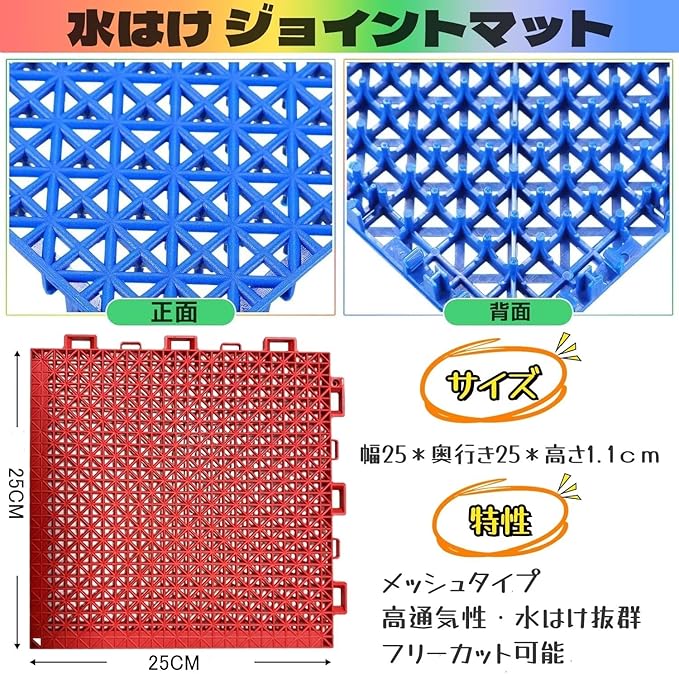 ★【商品仕様】サイズ:1枚の寸法:25cm*25cm 厚み:1.1cm 16枚セット/約1平方メートル ★MIMIER水はけマットは簡単に設置できるメッシュタイプです。カラーは全6色となり、カラーバリエーションが豊富でデザイン性も魅力です。お好みの色の配色で空間のインテリアをおしゃれに演出できます。ベランダやバルコニー、テラス、玄関間などに敷き詰めてプチリフォームでき、明るく快適な空間に変えます。