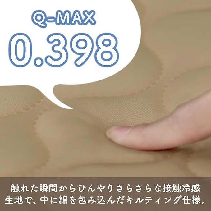 ひんやりさらさらな接触冷感生地で、中に綿を包み込んだキルティング仕様です。使っている間にマットがずれてしまわないように裏面にすべり止め加工付き。