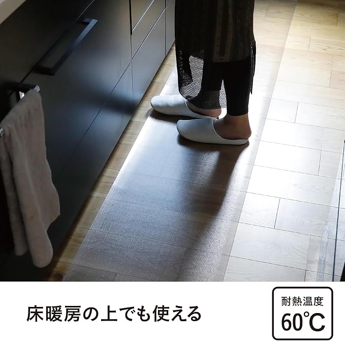 汚れてもすぐに拭けてお手入れ簡単な「atomico(アトミコ)透明キッチンマット」お部屋の雰囲気を崩さず、キズや汚れから守ってくれます。