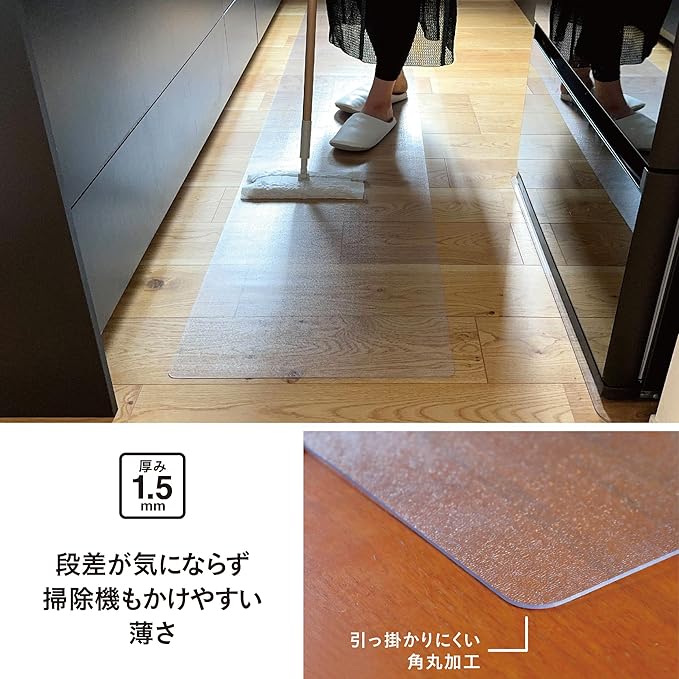 厚みも1.5mmと薄いため、段差が気にならず、掃除機やフローリングワイパーもかけやすい厚みです。また、4つ角は引っかかりにくい角丸加工を施しています。