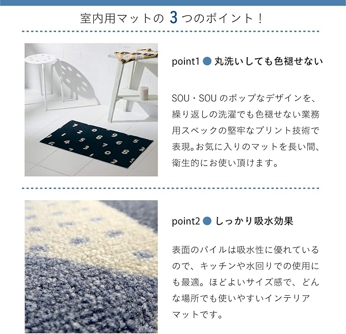 京都のテキスタイルデザインブランド「SOU・SOU」と神戸の業務用マットメーカー「クリーンテックス・ジャパン」のコラボレ-ションアイテム、ご家庭向け屋内用インテリアマット。