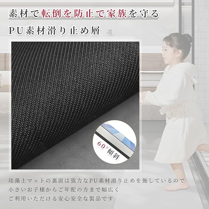 【高い吸水力 10秒で速乾】吸水量は従来の珪藻土の約2倍!超極細繊維PU透水層は通気性が良く、表面の水分が急速に蒸発し、速乾性に優れているので、湿気による細菌の繁殖も抑えます。従来の珪藻土に満足出来なかったお客様もきっとご満足頂けます。